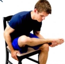 The piriformis muscles can be stretched in a variety of positions. Today, we will discuss how to stretch the piriformis in a seated position. I really like stretching in this position because we are able to stretch both the piriformis and with a slight modification we can stretch out the entire hip. To stretch the piriformis while sitting in a chair, first cross your leg with the ankle of one foot on the knee of the other. Next, pull the top knee upward towards your opposite shoulder for a stretch (Figure A). To get a stretch deeper into the hip, cross your affected leg on top of the other as shown below. Next, gently lean forward until a stretch is felt along the crossed leg (Figure B).